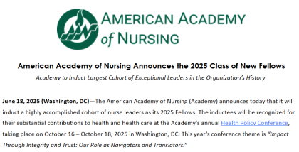 美国护理科学院始建于1973年,作为一个国际性组织,致力于通过创造、综合和传播护理知识来推动卫生政策和实践,从而为公众服务。当选FAAN被认为是美国护理科学研究领域最高荣誉之一,也是全球护理界最负盛名的学术殊荣。本年度中国内地共有18名护理专家入选。