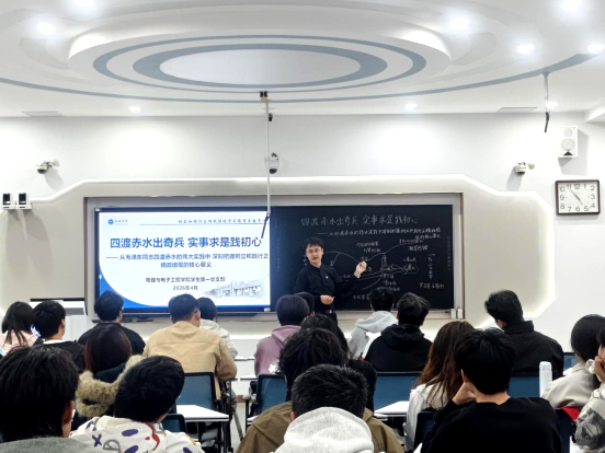 分享结束后,马广彬以“四渡赤水出奇兵 实事求是践初心——从四渡赤水的伟大实践中深刻把握树立和践行正确政绩观的核心要义”为题,讲授专题党课。党课从四渡赤水战役的历史背景入手,生动再现了红军在极端悬殊兵力对比下,转战川黔滇,彻底扭转长征被动局面的光辉历程。他结合习近平总书记关于树立和践行正确政绩观的重要论述,要求与会人员从四渡赤水精神中汲取智慧力量,知党情感党恩,将个人理想融入国家发展大局,结合专业发展,以实际行动践行新时代青年的使命与担当。