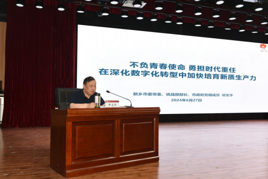 6月27日下午,在我校文化艺术中心,新乡市委常委、统战部部长、市政府党组成员祁文华为我校师生讲授题为《不负青春使命 勇担时代重任 在深化数字化转型中加快培育新质生产力》的专题思政课。新乡市有关单位同志、华亿在线手机版(大中国区)师生代表参加学习。副校长张银堂主持报告会。